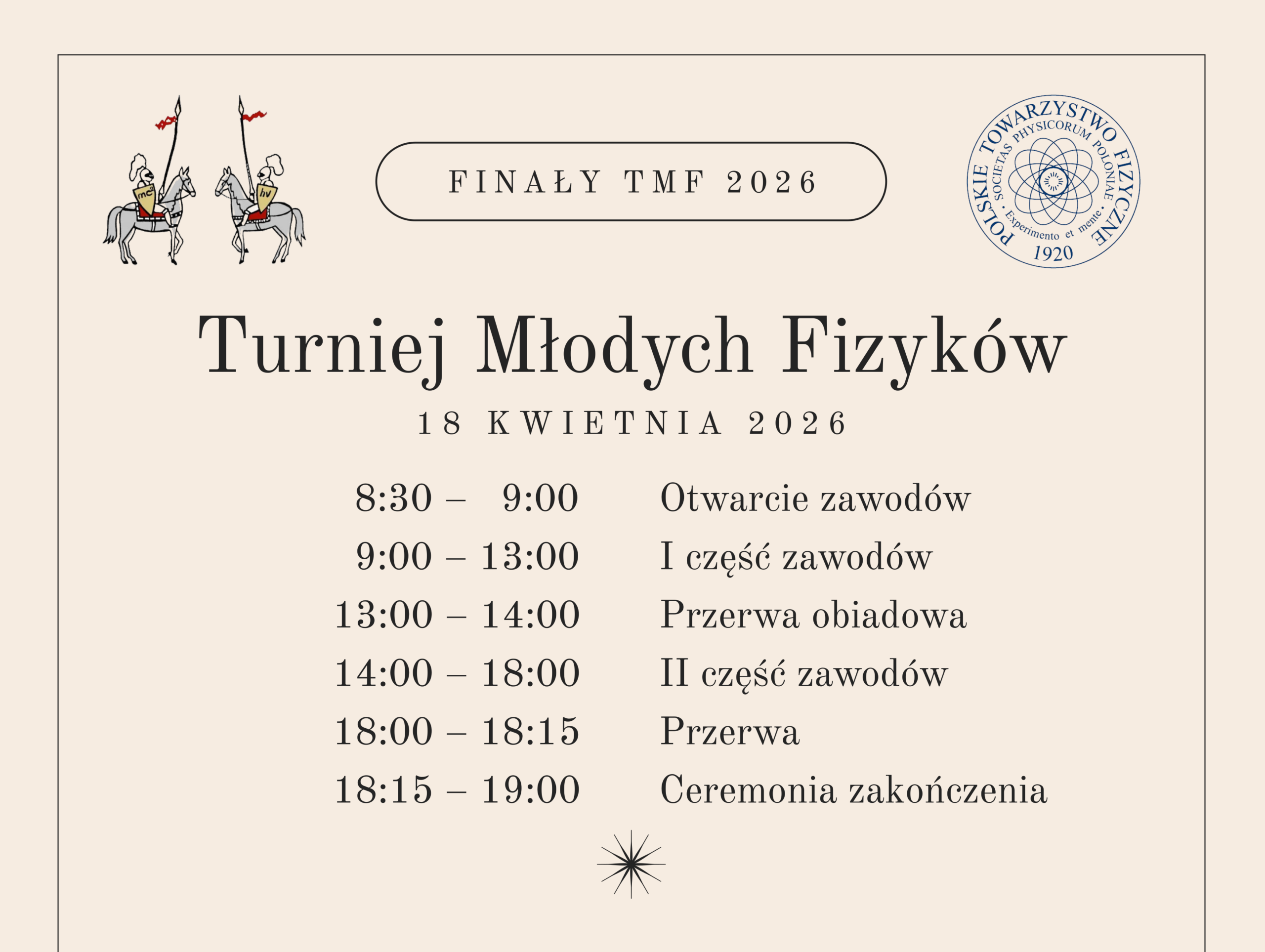 Serdecznie zapraszamy do śledzenia finałów TMF 2026 i kibicowania uczestnikom. Przed nami dzień pełen ambitnych prezentacji, naukowych dyskusji i spotkań młodych pasjonatów fizyki z całej Polski.